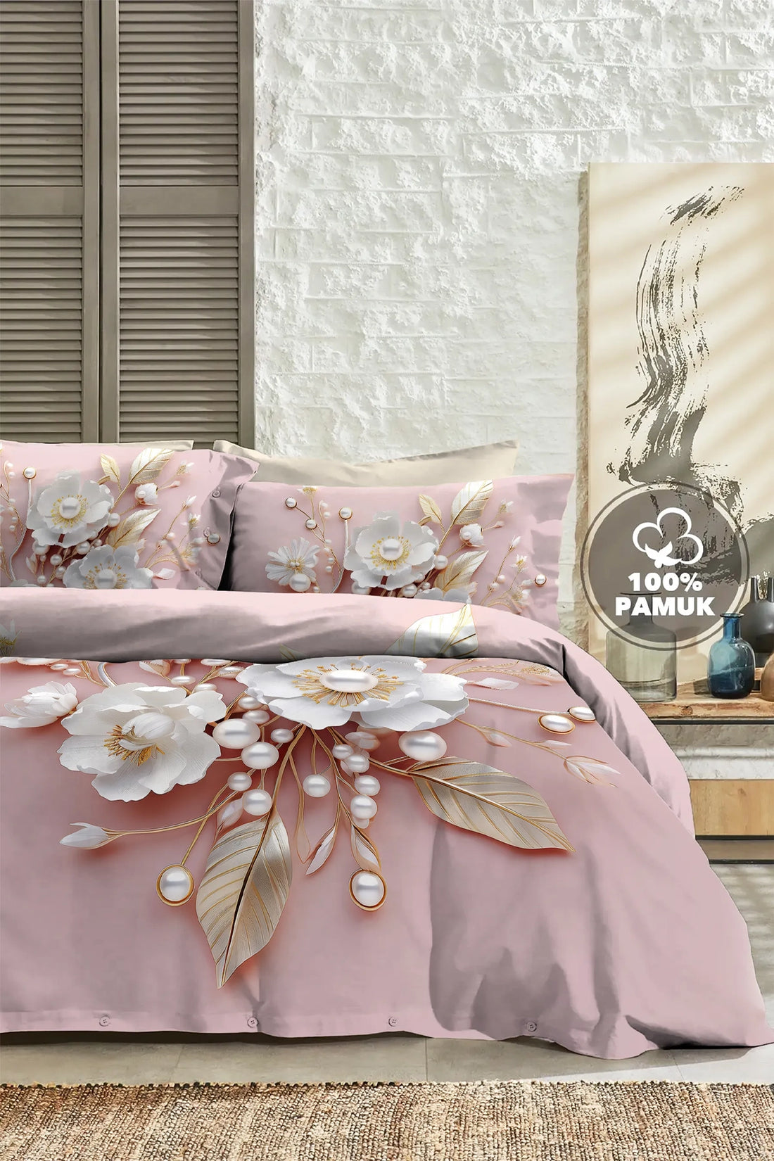 %100 PAMUK Percale Çeyizlik Luxury 5D Dijital Çift Kişilik Nevresim Takımı Lotus
