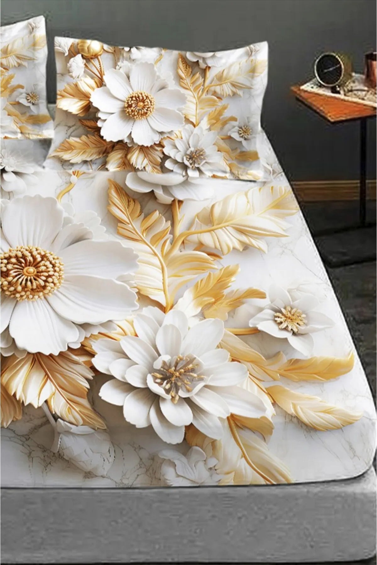 %100 Pamuk Lastikli Çarşaf Özel Tasarım 5D Dijital 60 Tel Gold Rose