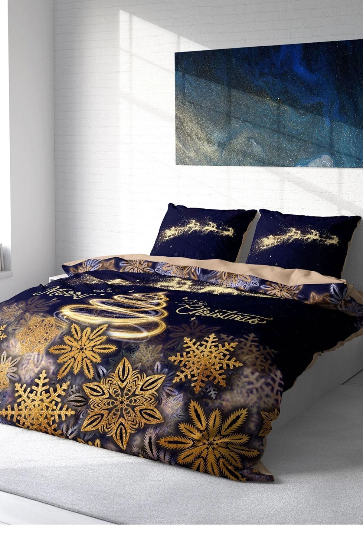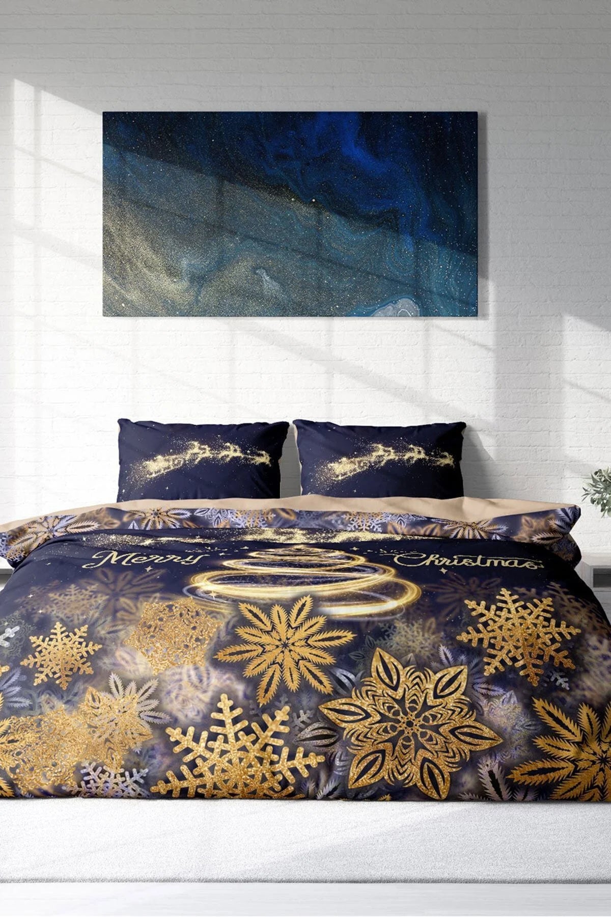Yılbaşı Nevresim Takım %100 Doğal Pamuk Merry Christmas Çift Kişilik Gold Coffee