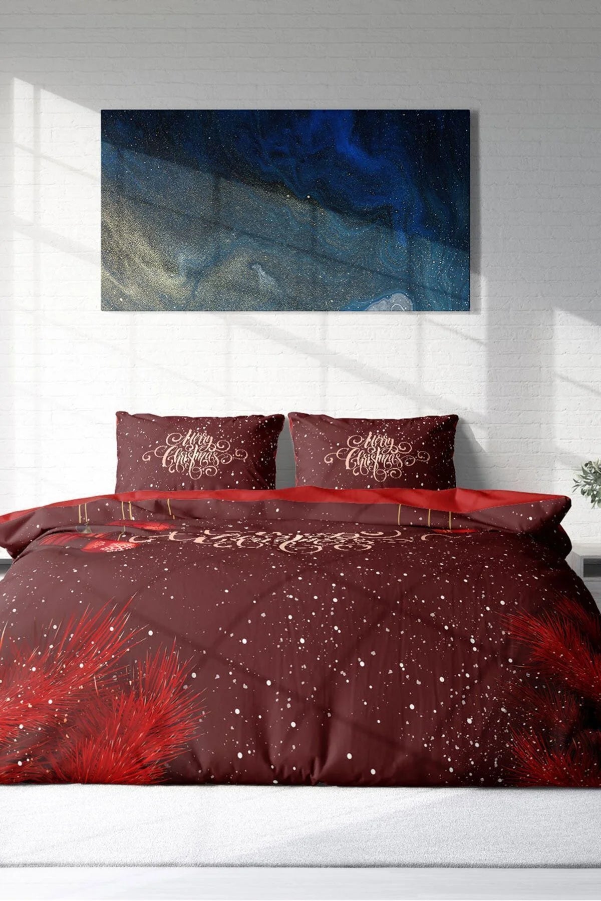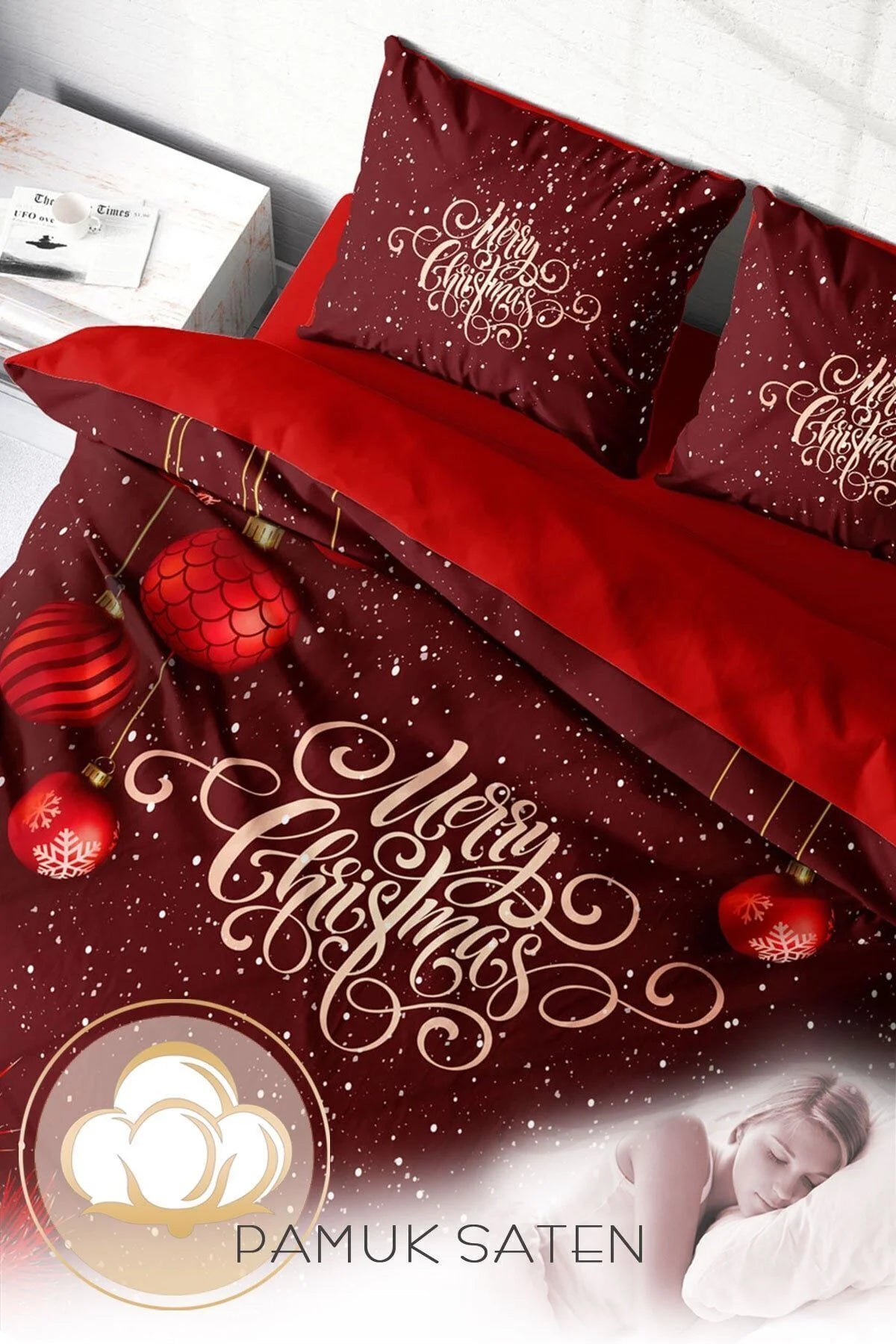 Yılbaşı Nevresim Takım %100 Doğal Pamuk Merry Christmas Çift Kişilik Red Ball
