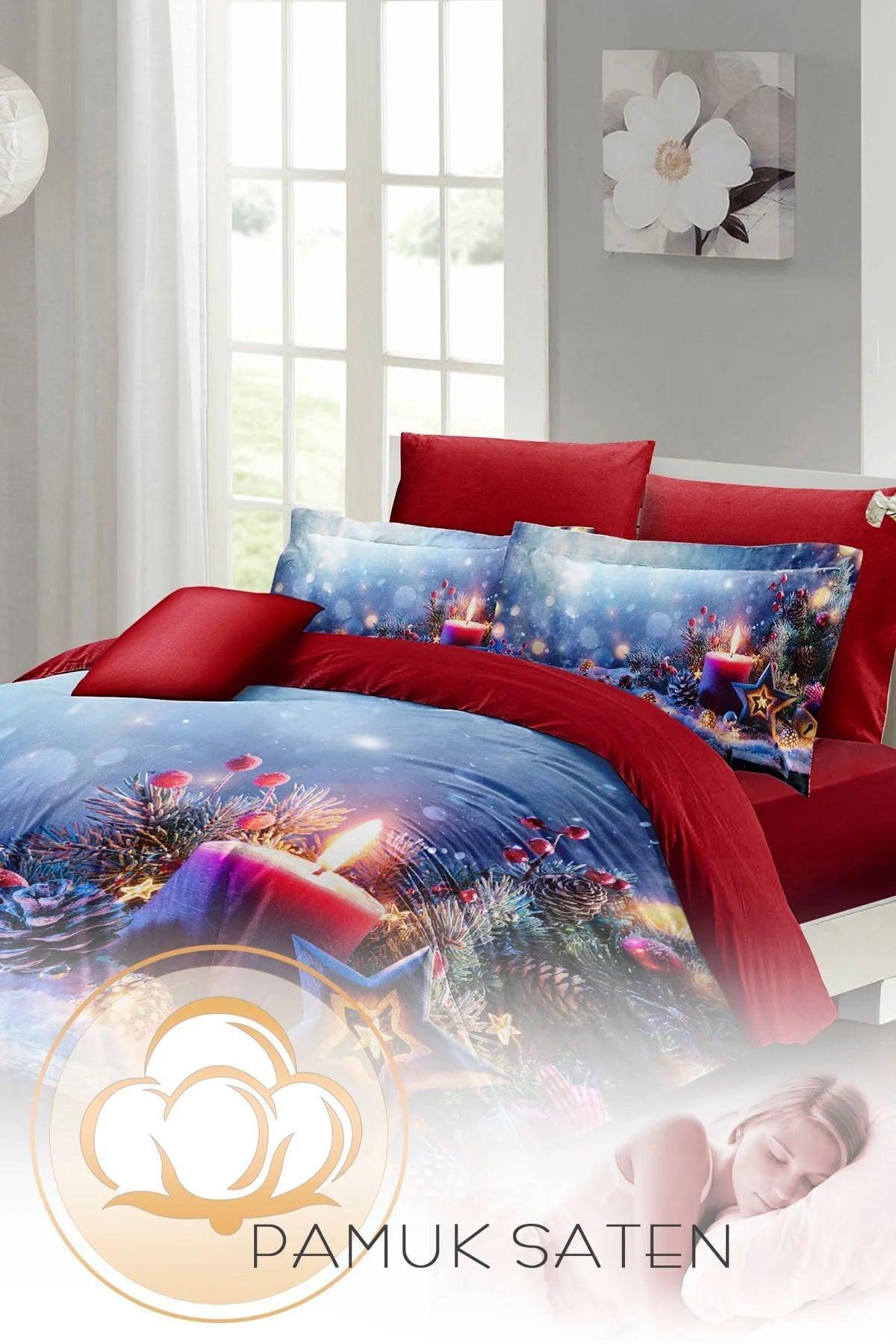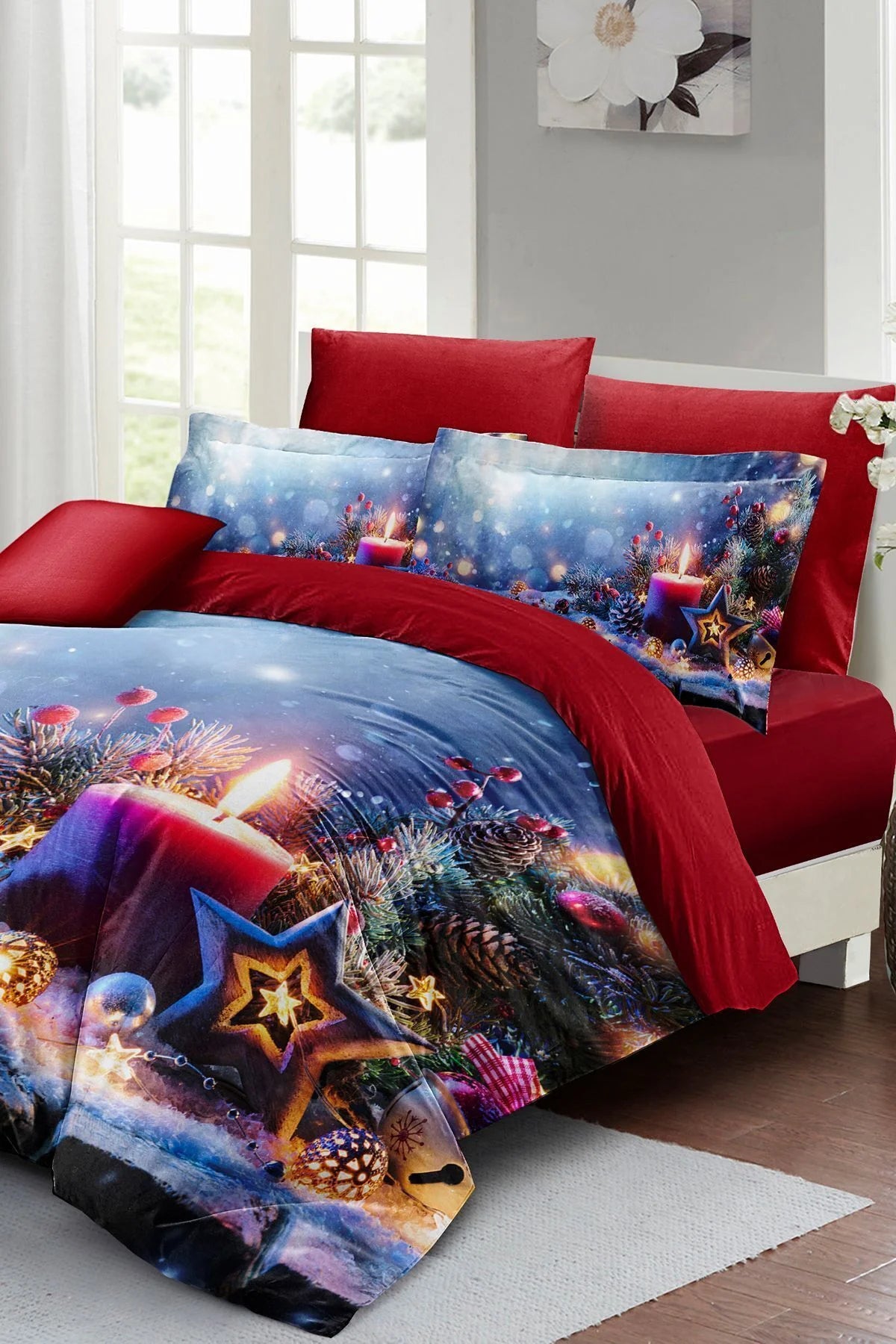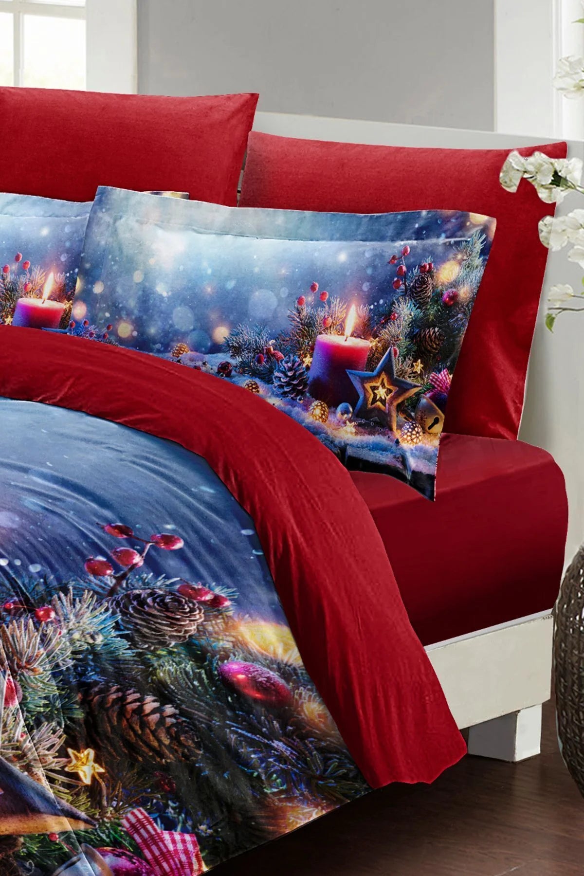 Yılbaşı Nevresim Takımı Çift Kişilik %100 Pamuk Saten Christmas Candle