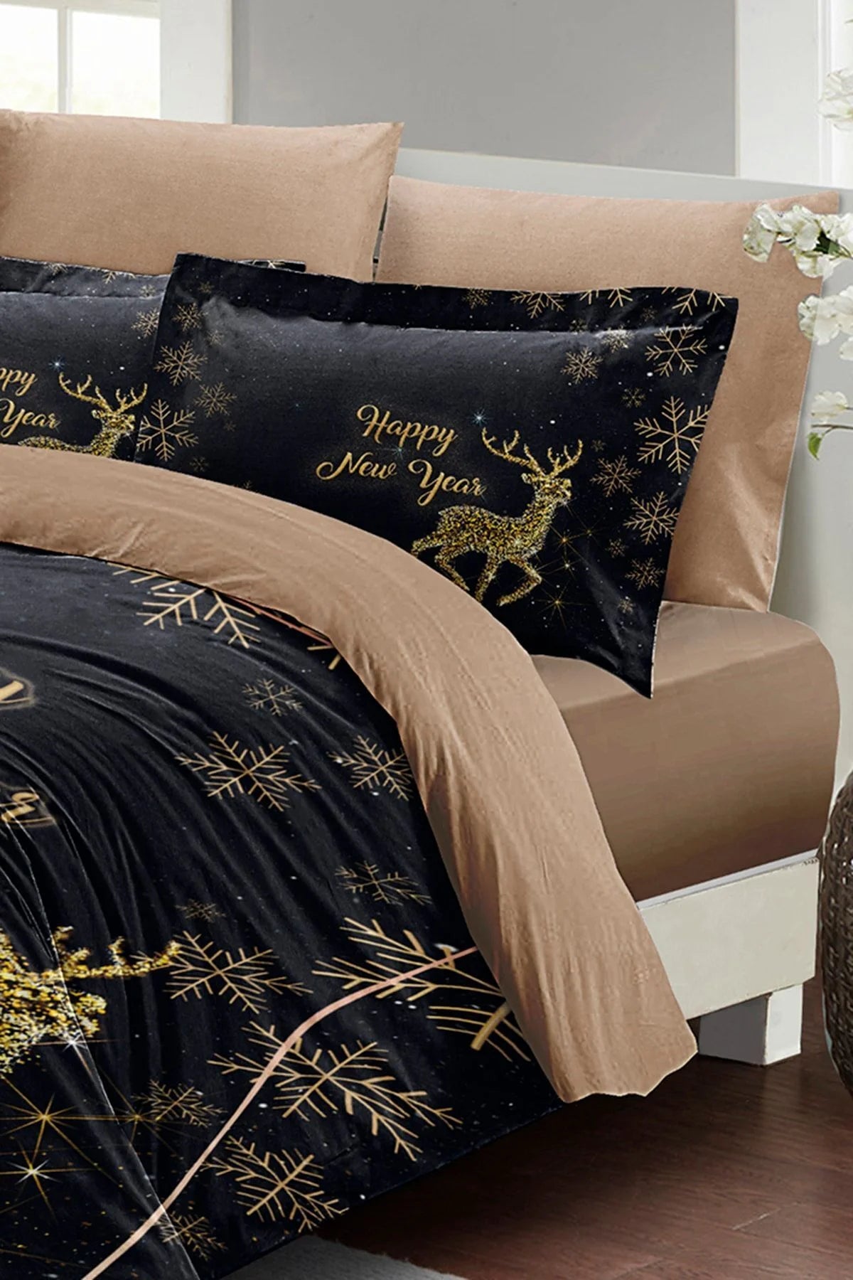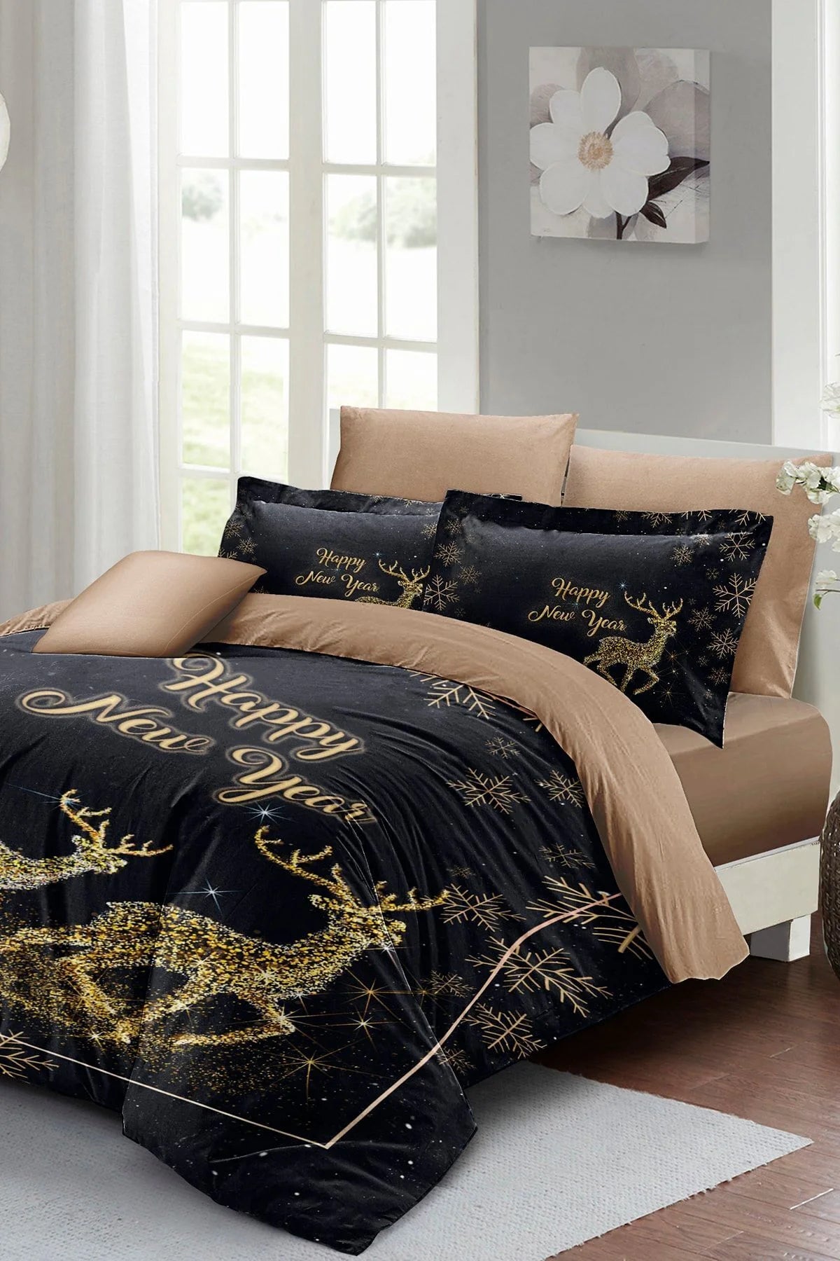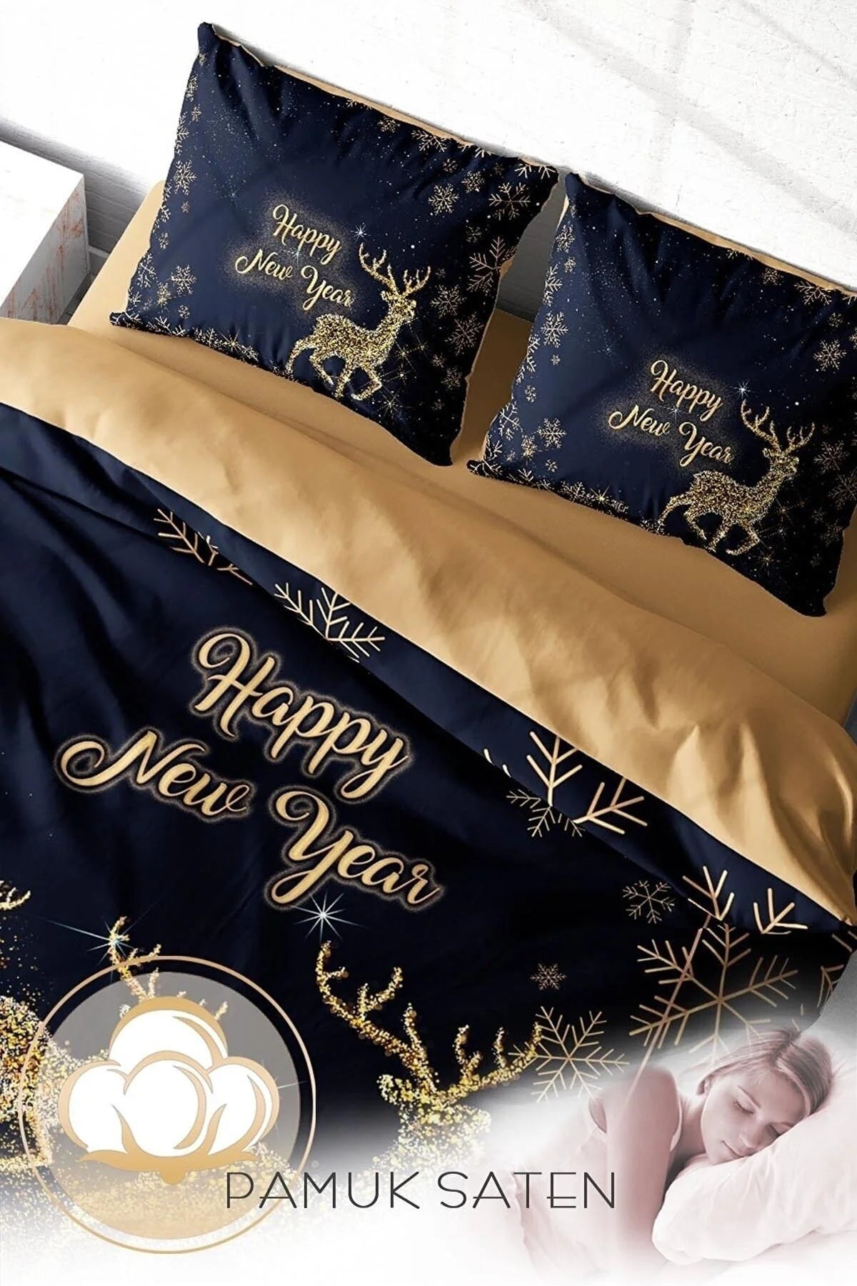 Yılbaşı Süsü Geyik Noel %100 Pamuk Saten 3D Çift Kişilik Nevresim Takımı