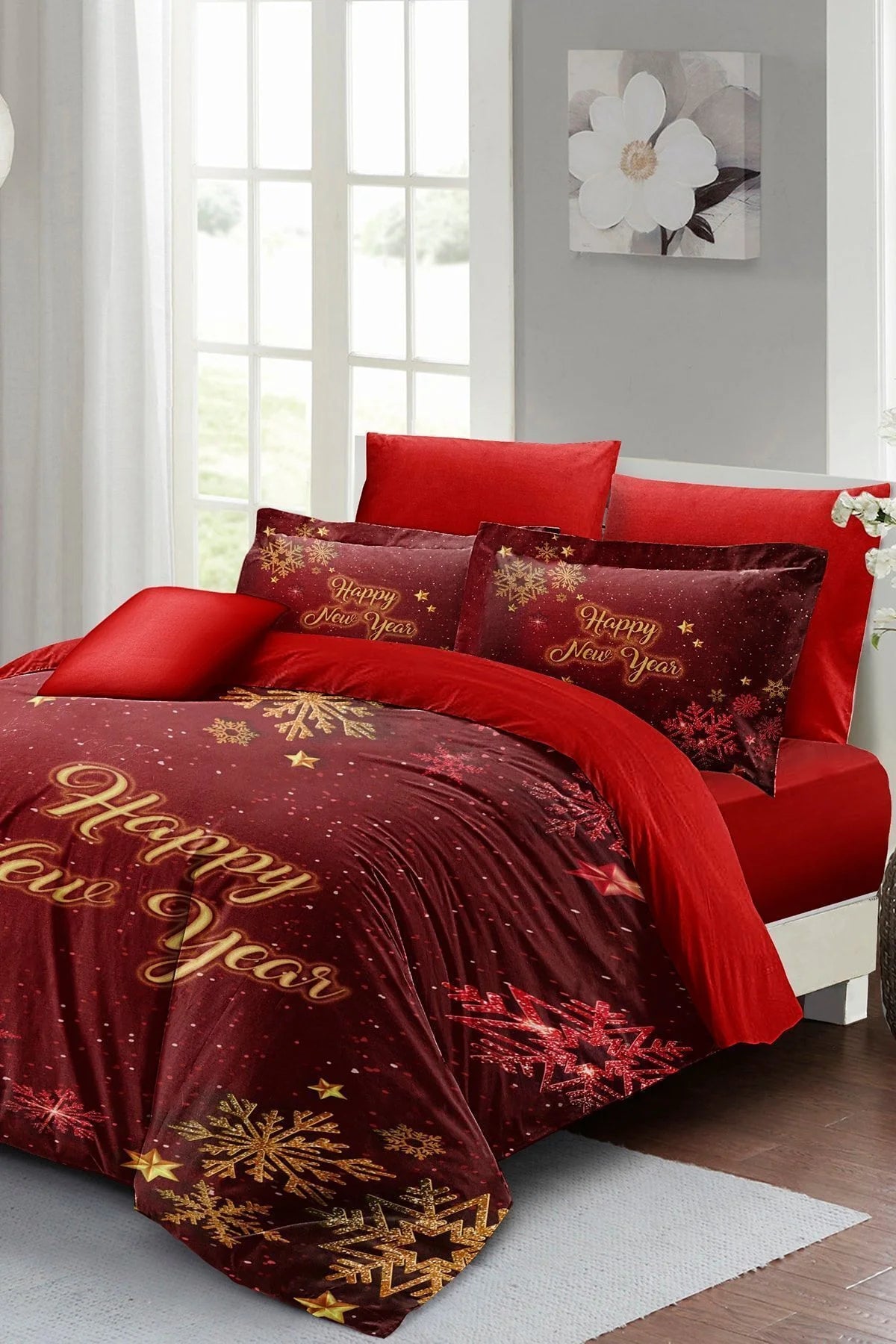 Yılbaşı Süsü Kar Kristalleri Noel %100 Pamuk Saten 3D Çift Kişilik Nevresim Takımı